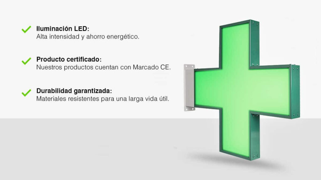 Cruces luminosos: Cruces de farmacia con iluminación LED de alta intensidad, visibles desde grandes distancias, para atraer la atención de los clientes y peatones.